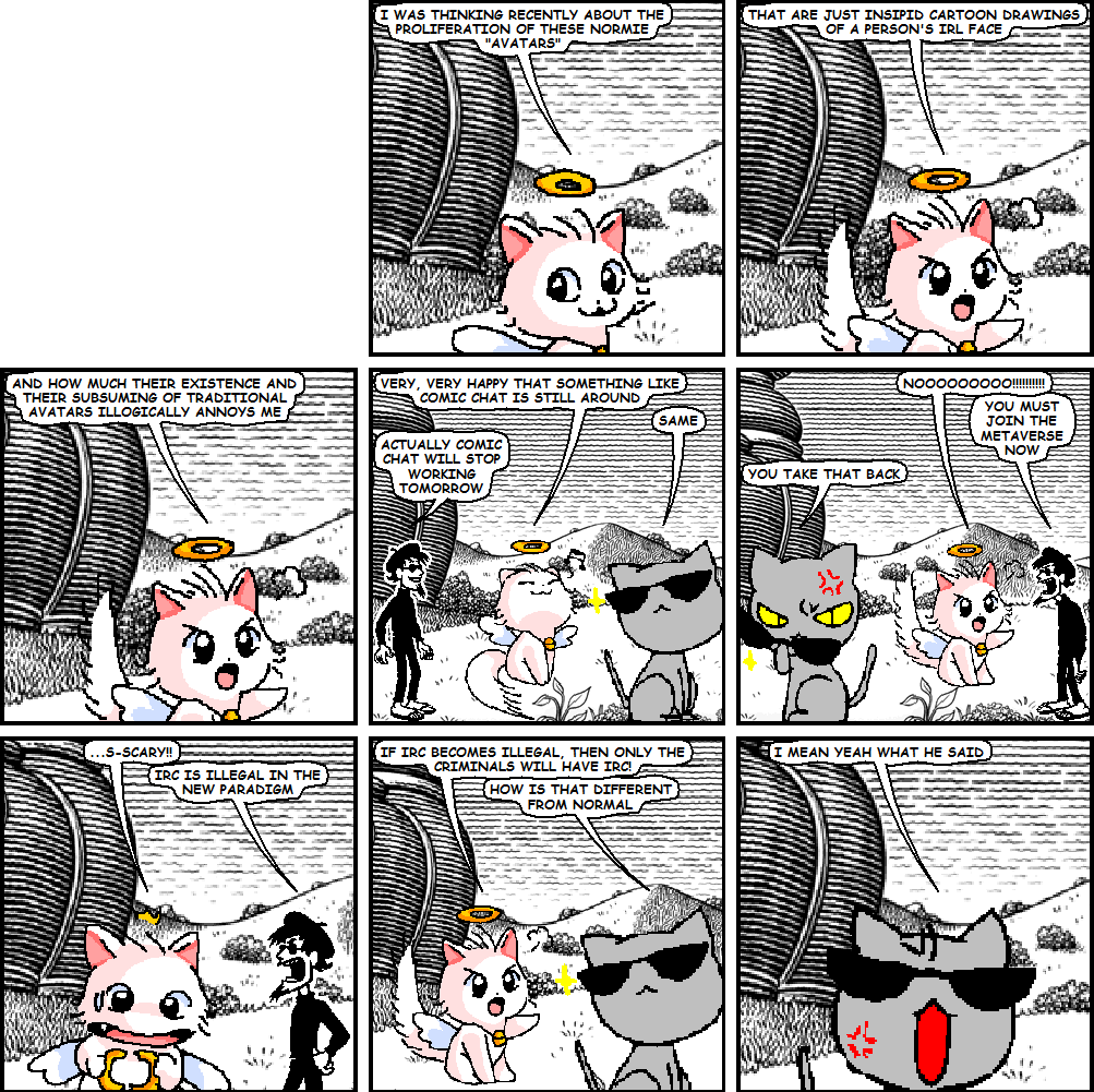 usually pointless), and a weekly Saturday-centric event named Comic Chat Caturday. If you're wondering what the allure of this ancient program is, looking for obscure tricks on using it, or simply looking for some fantastic Internet humour, the helpful tips and humourous Comic Chat screenshots on this page will hopefully be of help.